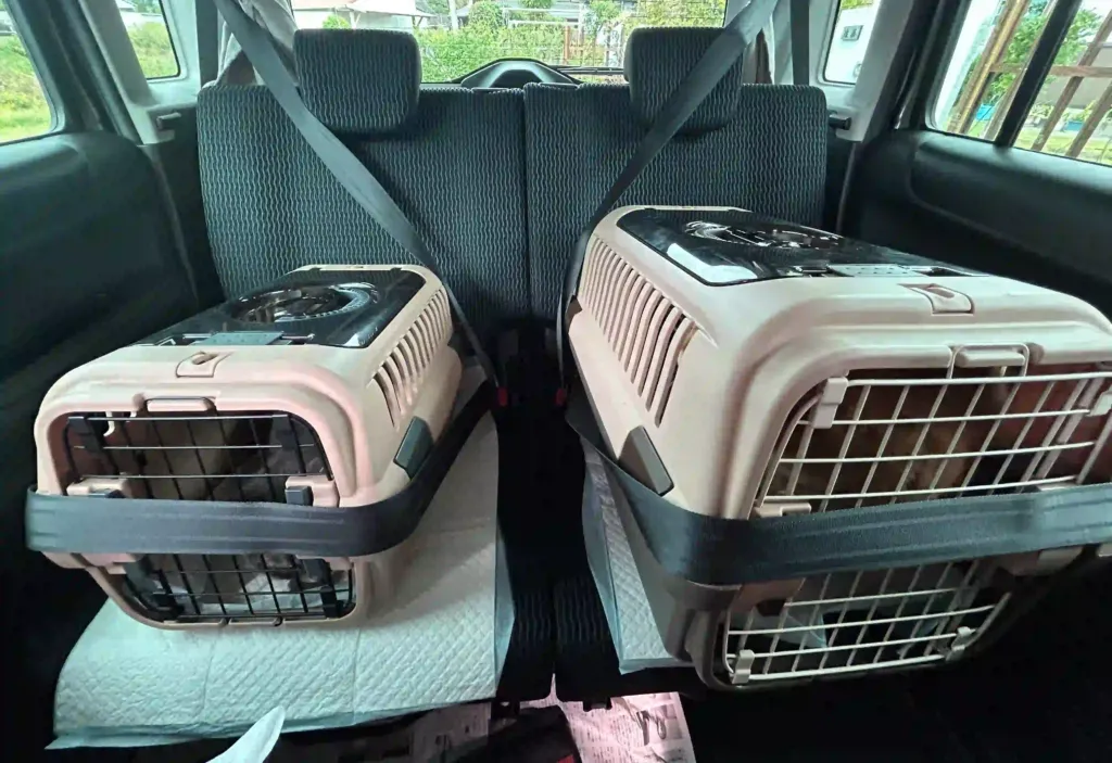 キャリーを車の後部座席に2つ並べ、シートベルトをして出発。