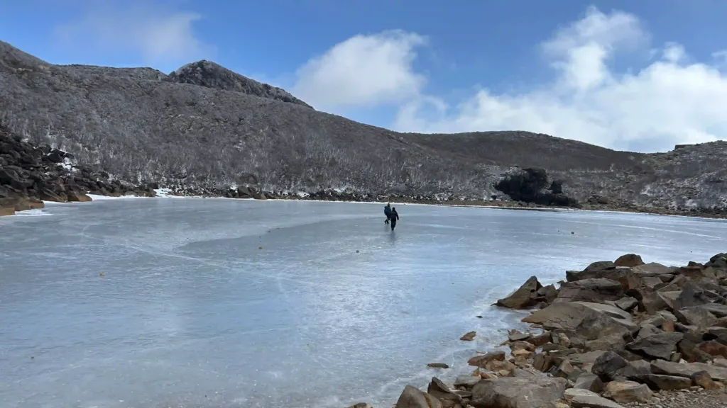池が凍っていて上を歩くことができます